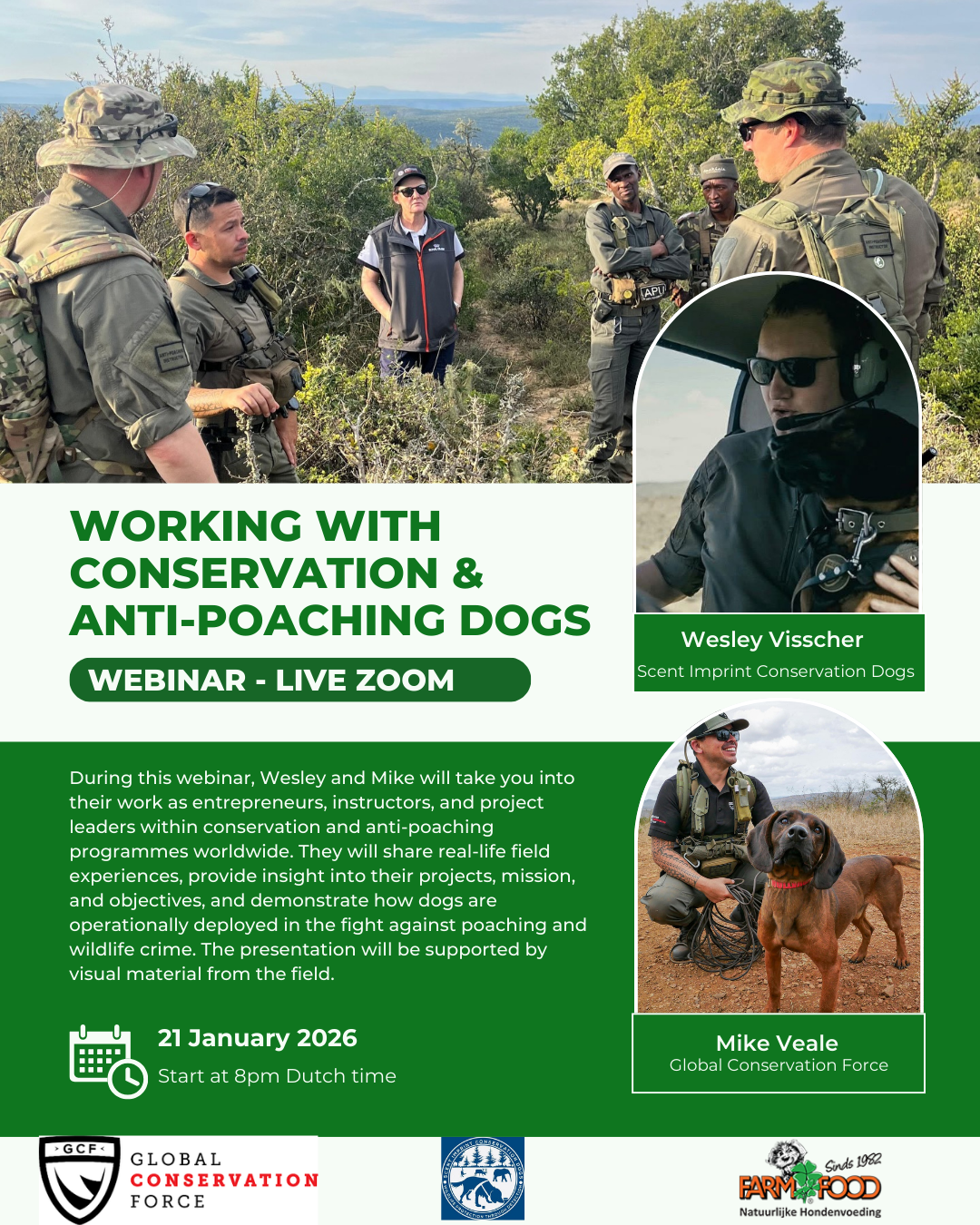 During this session, Wesley and Mike will take you inside their work as entrepreneurs, instructors and project leaders within conservation and anti-poaching programmes worldwide. They will share real-world field experience, provide insight into their projects, mission and objectives, and demonstrate how dogs are operationally deployed in the fight against poaching and wildlife crime. The presentation will be supported by visual material from the field.