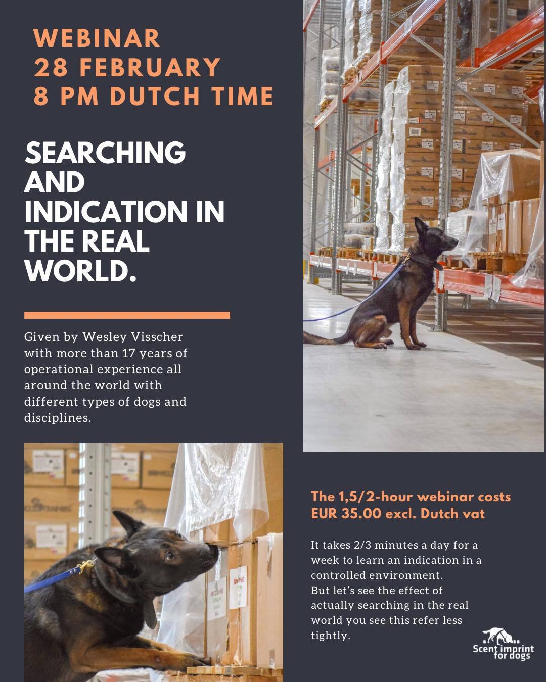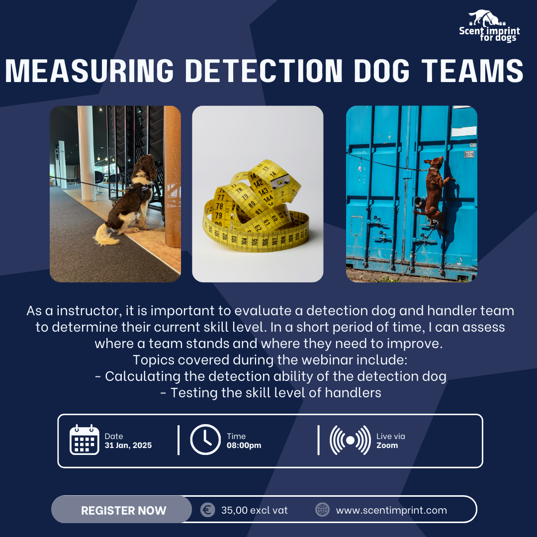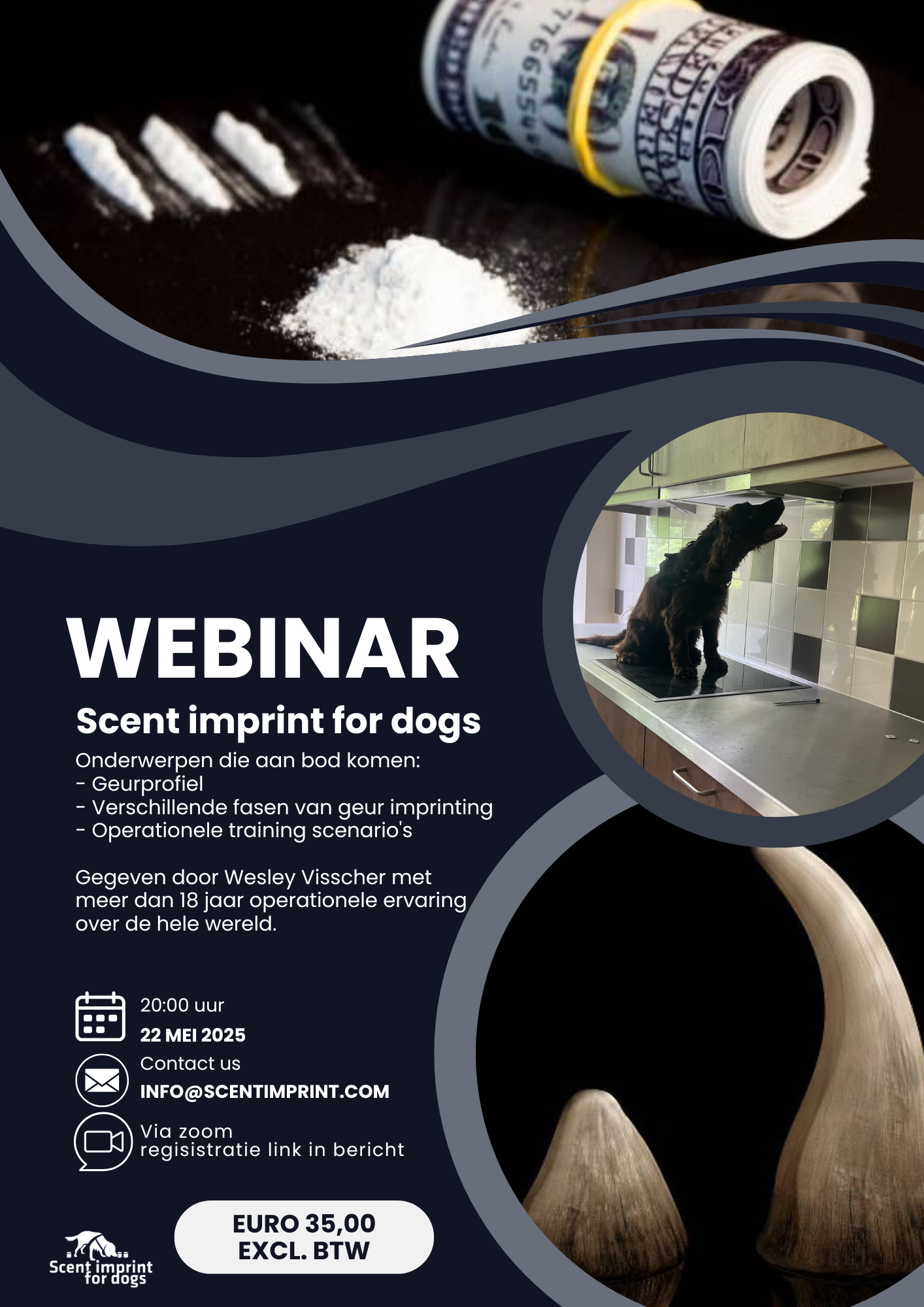 In dit webinar duiken we diep in de opbouw van geurherkenning en het correct aanleren en onderhouden van geurimprinting bij detectiehonden. De focus ligt op zowel theoretisch begrip als praktische toepasbaarheid binnen operationele trainingen.